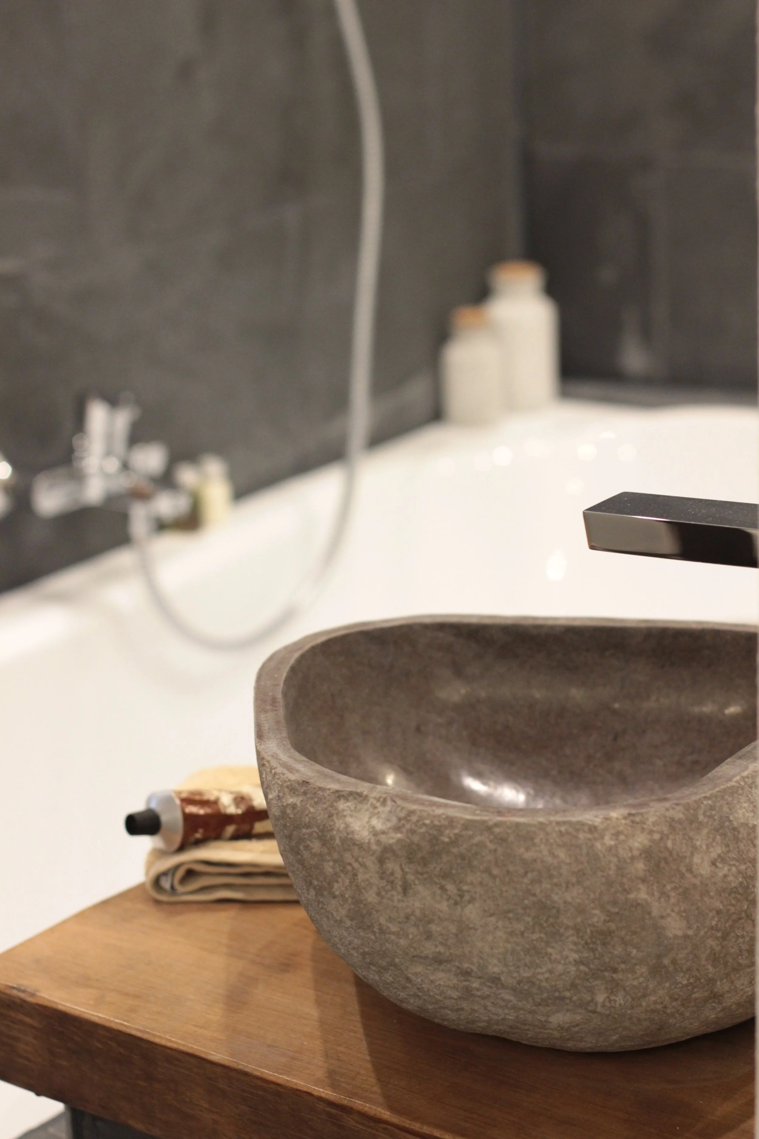 Ein offenes Bad – mitten im Raum offen – mit Badewanne & Dusch-Armatur, Steinwaschbecken, kuscheligen Handtüchern in Top-Qualität, Haartrockner. Das WC ist separat und direkt nebenan